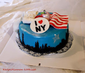 Tällä kertaa sain ilahduttaa kakulla yhtä upeaa nuorta neitokaista hänen täyttäessä 14-vuotta. Toiveena oli New York-aiheinen kakku ja kun täytevaihtoehtoja ehdottelin, niin valinta osui supersuosittuun ja hyvään minttusuklaatäytteeseen. Tätä täytettä on tullut viime aikoina tehtyä melko usein ja joka kerta se maistuu yhtä hyvältä. Kakkuun tein kuuden munan kaakaokakkupohjan, jonka paistoin 22 senttisessä vuoassa. Koska vuoka oli melko matala, tein varmuuden vuoksi siihen ylimääräiset reunat foliosta. Jälkikäteen ajatellen leivinpaperi olisi ollut fiksumpi vaihtoehto. Korkeassa pohjassa paistoaika oli paljon pidempi, olisiko ollut uunissa hieman vajaa tunnin.
